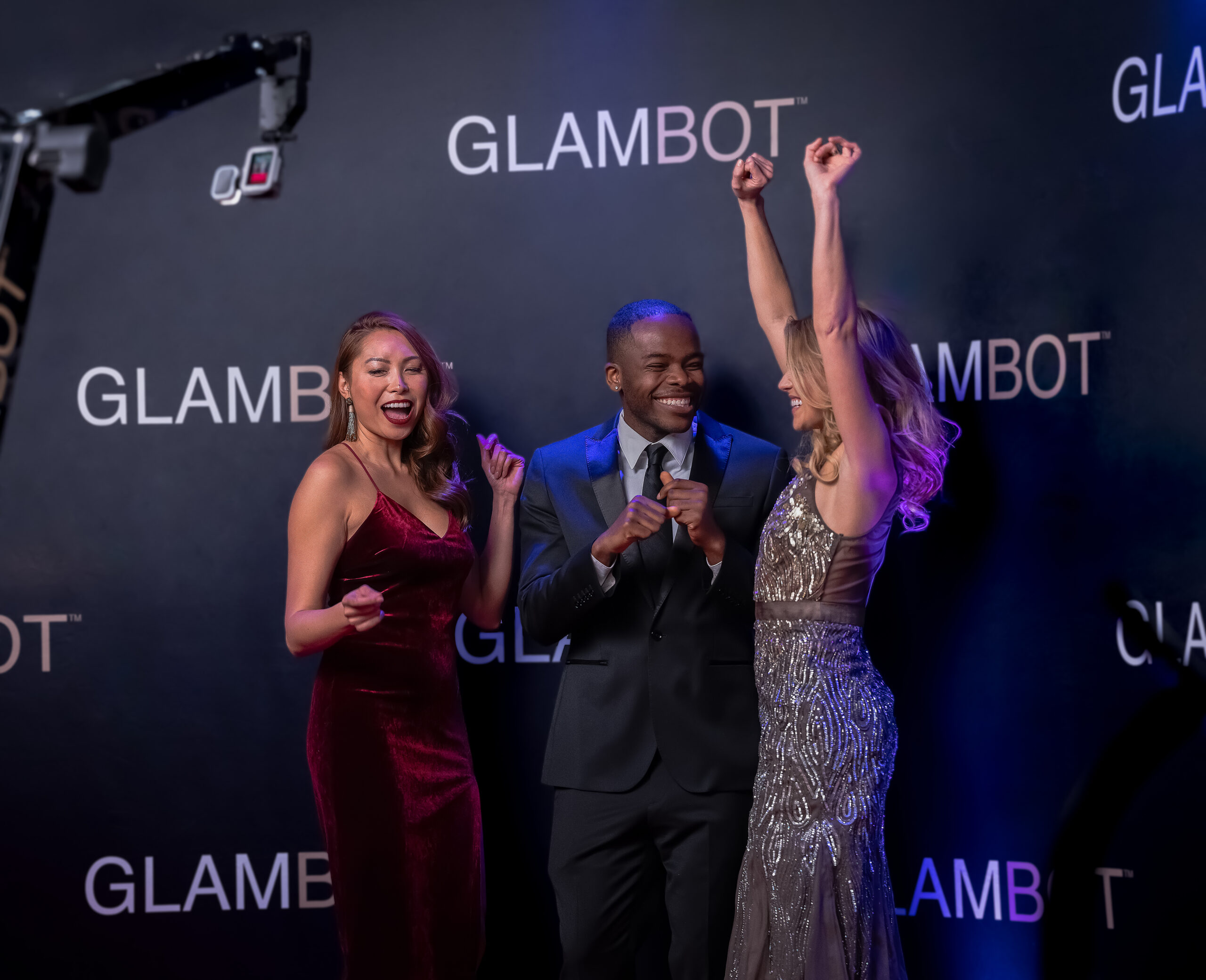 The Glam Bot Experience brings cinematic, slow-motion video production to your event. Using a high-speed robotic camera, guests are captured in dramatic motion as the camera sweeps around them—creating stunning red-carpet style videos made famous at major award shows.